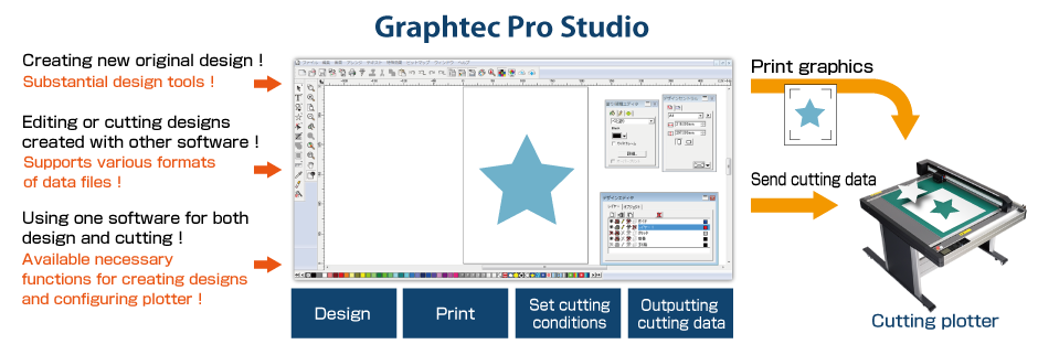 C'est le logiciel pour créer des conceptions originales avec fonctions améliorées telles que les formes automatiques, l'ombrage et les fonctions d'édition. Il ressemble à Adobe Illustrator et CorelDRAW. Il peut également configurer les conditions de coupe et d'autres paramètres sur le traceur. L'importation des types de fichiers EPS, Ai, CMX et PDF sont prisent en charge. Compatible PC uniquement Windows 10/8/7