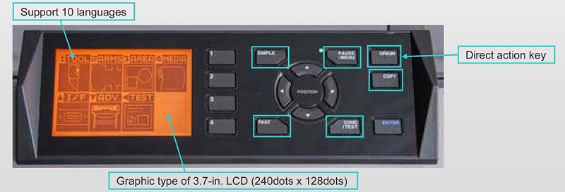 Le grand écran LCD et le clavier permettent d'accéder facilement à la configuration des conditions de découpe de la Graphtec CE 7000-130. Les icônes sont reconnaissables d'un seul coup d'œil.