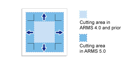 L' ARMS VERSION 8.0 élargit la zone de découpe pour inclure la zone en dehors des repères. Cela augmente l'efficacité de la production en réduisant la zone non utilisée du média.