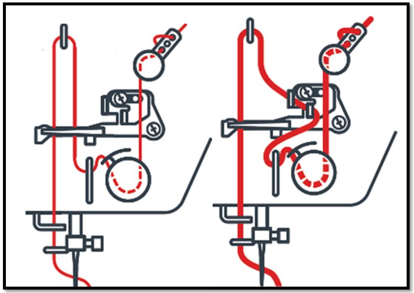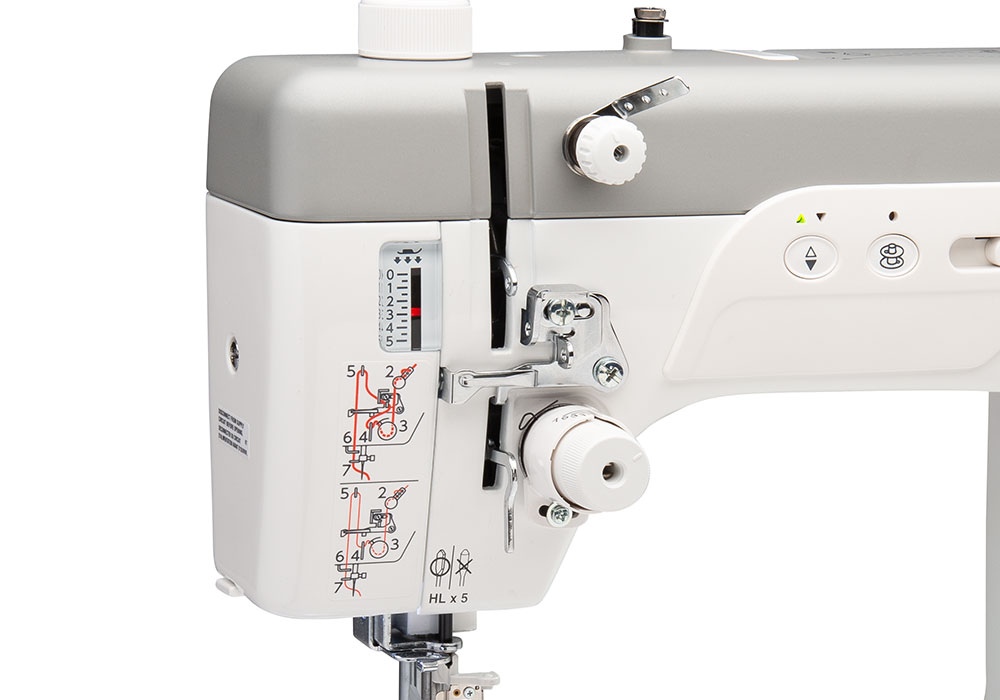 Janome a développé un guide fil avec une variation automatique de la tension peut importe l'épaisseur du fil et du tissus. Il stabilise la tension du fil lors de la couture de tissus épais comme le cuir, la toile cirée, le skai, ou autres matières techniques.