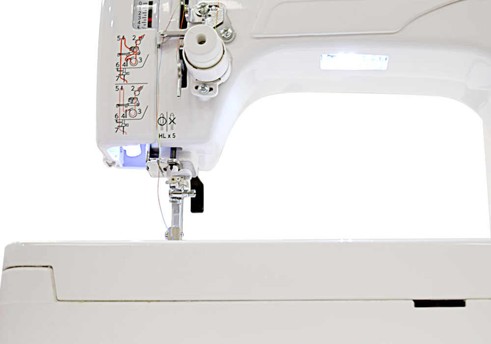 Les six lampes LED Ultra Bright puissantes pour un espace de travail sans ombre. Deux LEDs sont directement placées autour de la barre à aiguille pour donner une lumière directe dans la zone de couture et quatre autres LEDs illuminent la zone de travail.